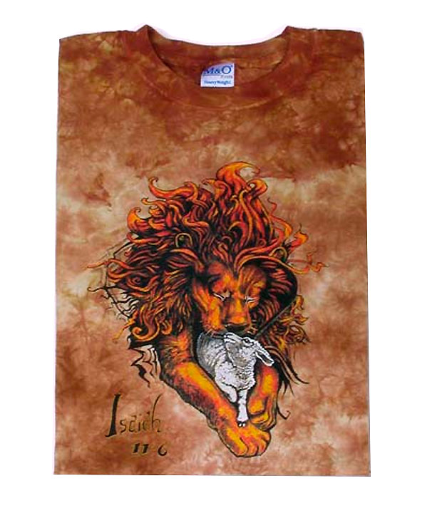 On the Front of the t-shirt it has a very nice picture of the Lion laying down with the Lamb with Isaiah 11:6 noted